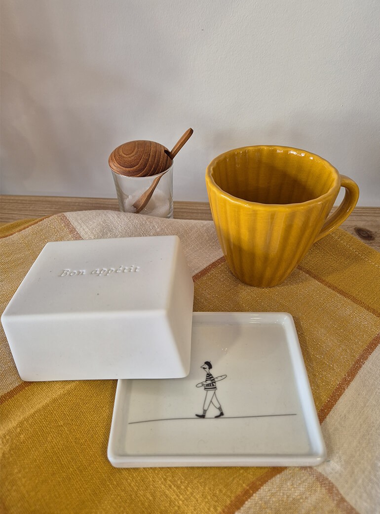 En effet ce petit beurrier en porcelaine allie élégance et praticité. Son couvercle plat permet d'optimiser la place dans le réfrigérateur et à la particularité de nous souhaiter un bon appétit pour réveiller nos papilles, tandis que son support révèle au fil de votre consommation le petit bonhomme avec son béret et sa baguette.