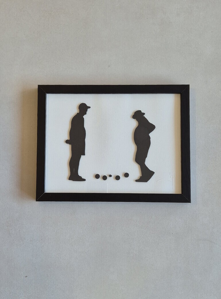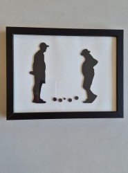 Ces joueurs de pétanque sont en bois, ainsi que le cadre qui les met en valeur