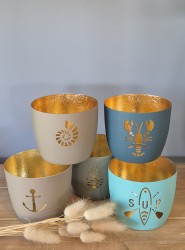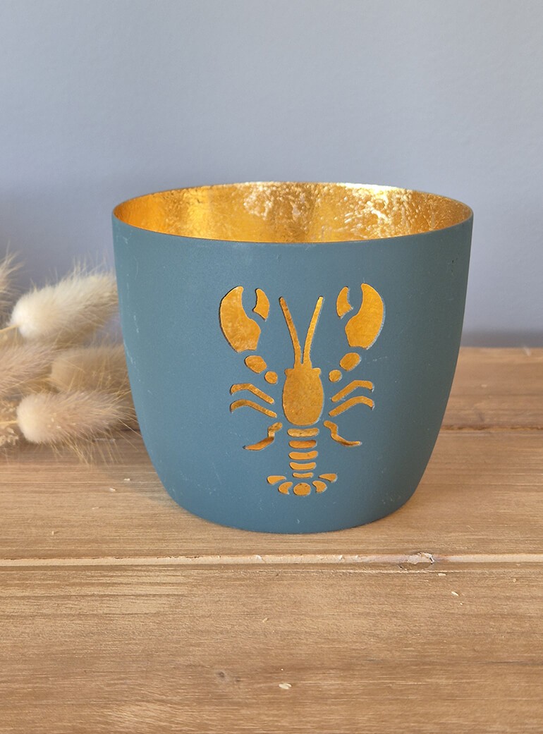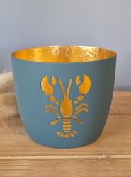 Ce photophore en metal est autant original que joli. Sa couleur mate, d'un bleu/vert profond, lui donne beaucoup de charme et d'élégance et vient en contraste avec son intérieur doré qui lui donne un air festif et permet une meilleure diffusion de la lumière.